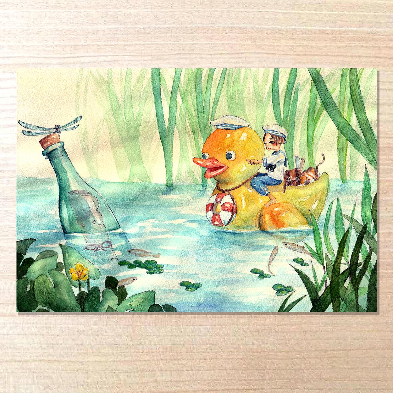 小さな水兵さんと三毛猫がアヒルのおもちゃに乗って、小川の探検をしているイラストです。