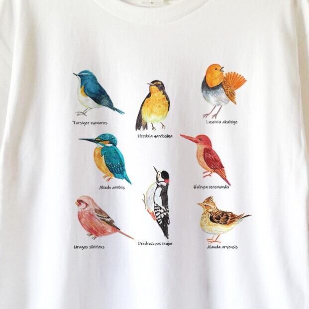 日本の森林や平地に生息している野鳥たちのイラストで図鑑風の白Tシャツを作りました。