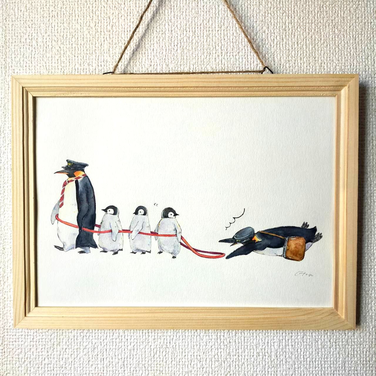 子ペンギンを先導する運転手さんやしっかりと列になって歩く子ペンギンたち、転んでしまった車掌さんの可愛らしい様子を描いています。