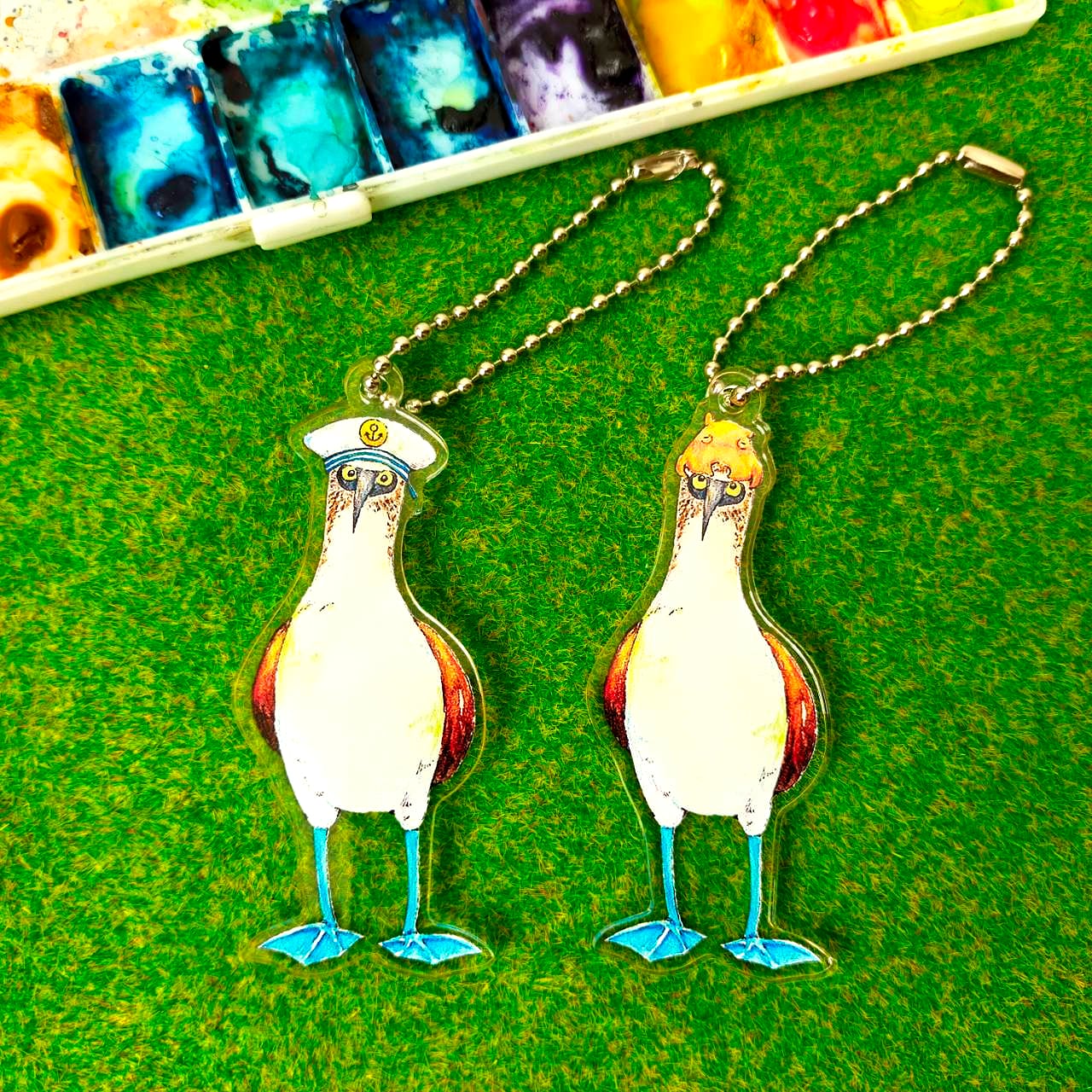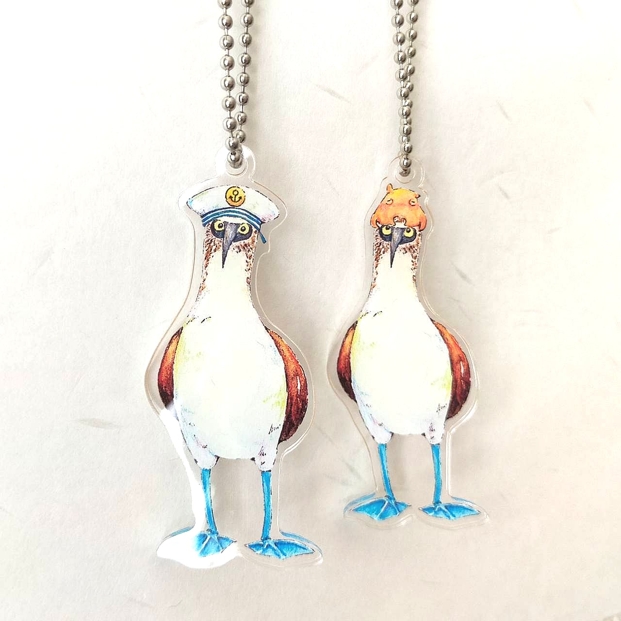 帽子をかぶっておめかししているアオアシカツオドリのアクリルキーホルダーです。