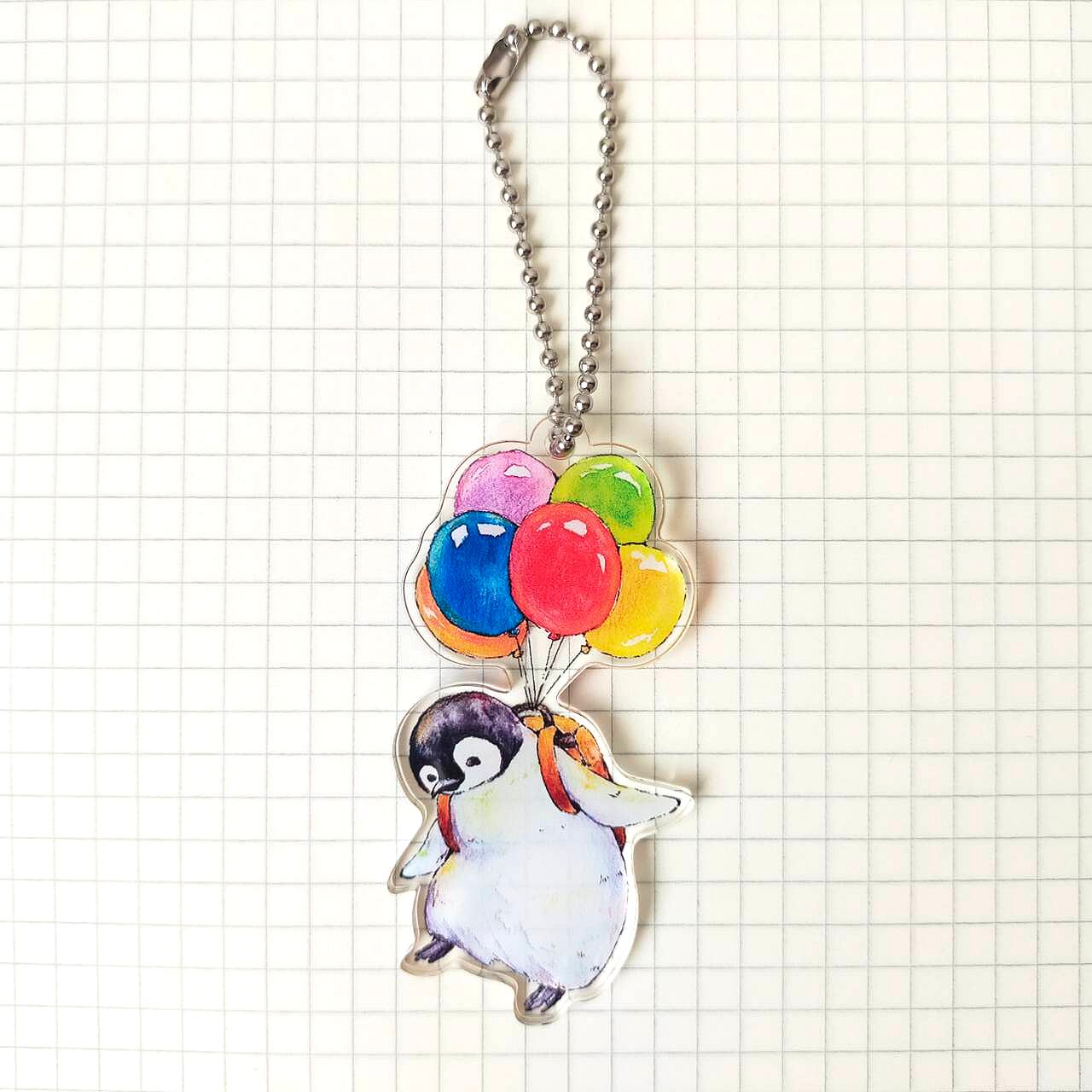 コウテイペンギンのヒナが、たくさんの風船を背中につけて浮かんでいるアクリルキーホルダーです。