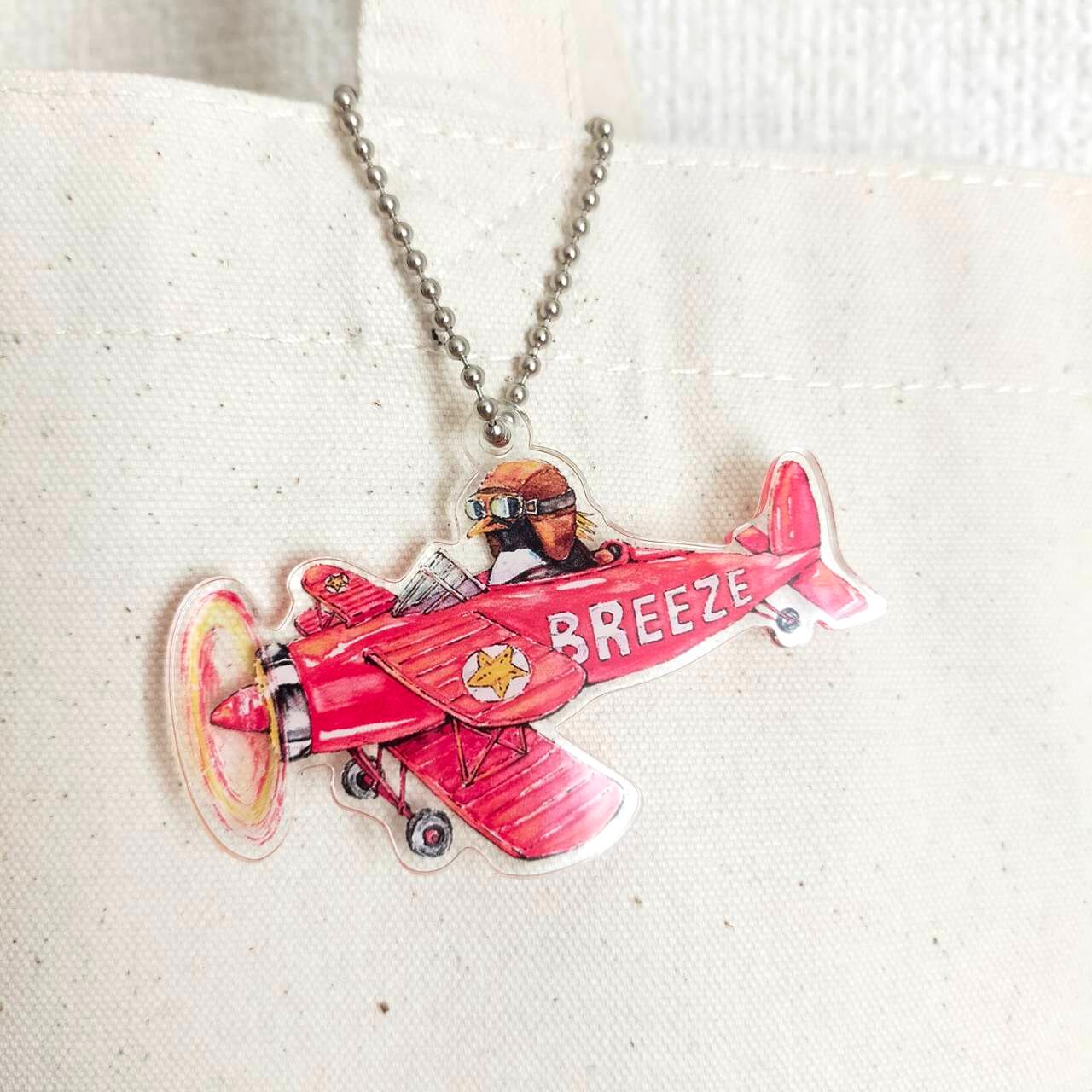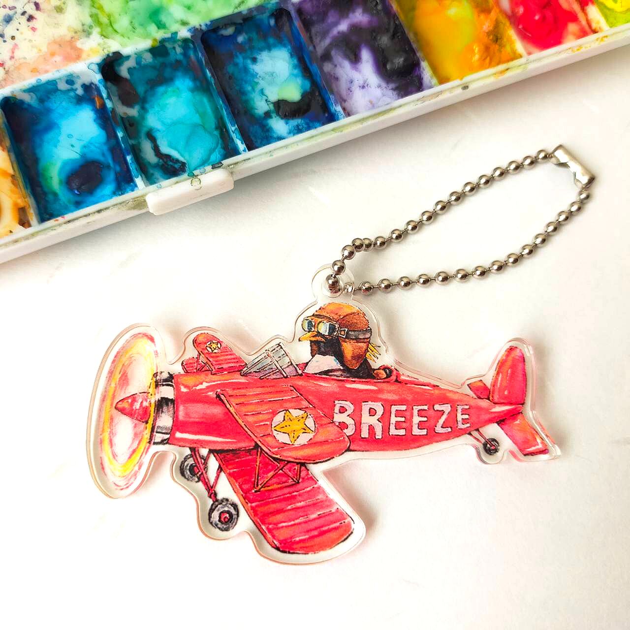 イワトビペンギンがレトロな赤い飛行機に乗って飛んでいるアクリルキーホルダーです。
