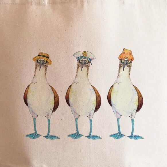 帽子をかぶっておめかししているアオアシカツオドリのトートバッグです。