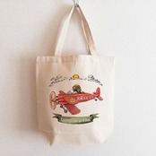 イワトビペンギンがレトロな赤い飛行機に乗って飛んでいるデザインのトートバッグです。