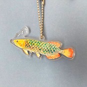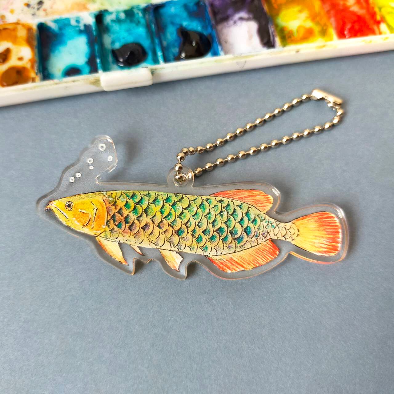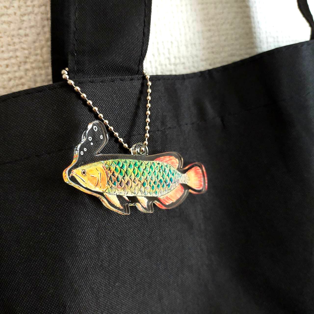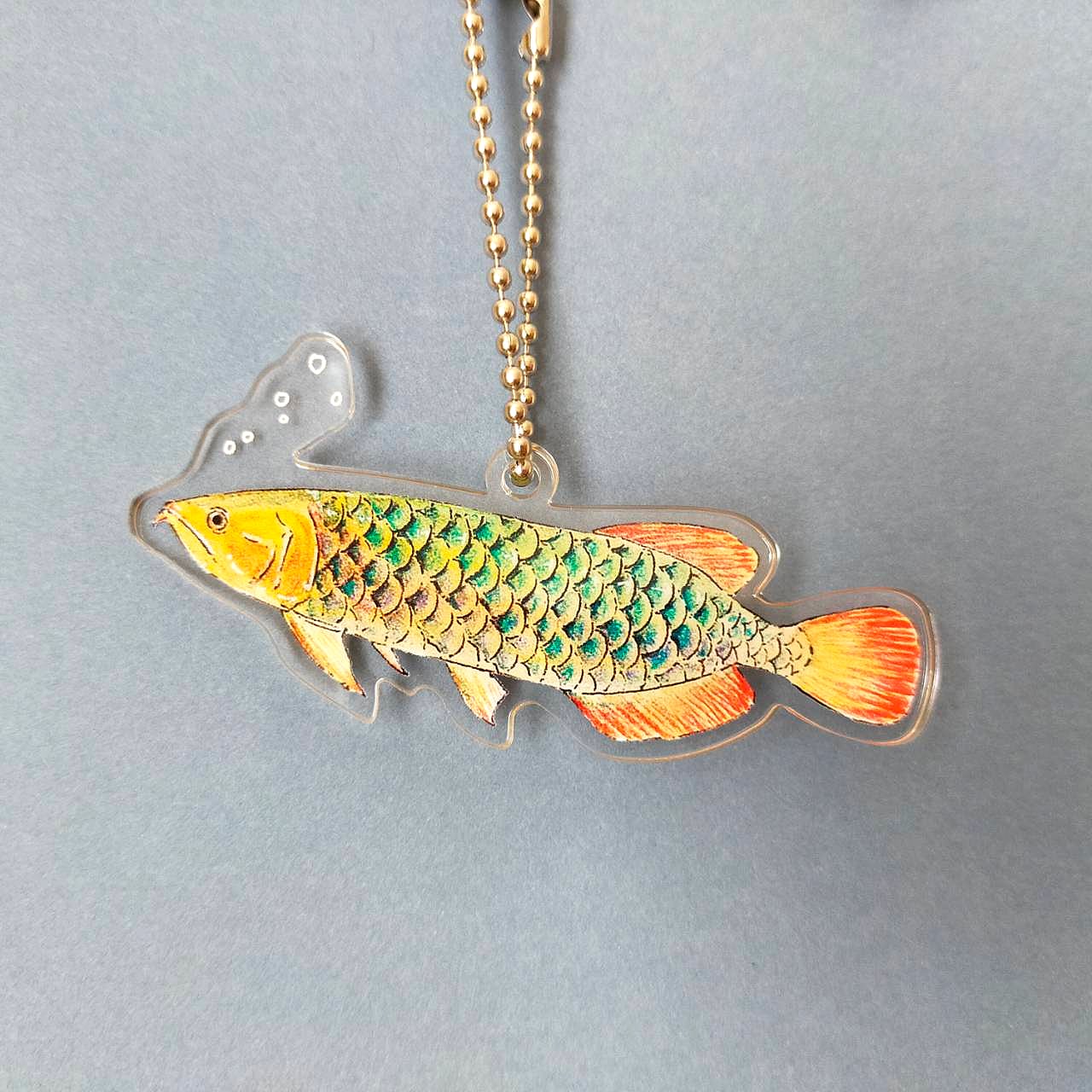 アジアアロワナ(グリーン)が優雅に泳いでいる様子のアクリルキーホルダーです。