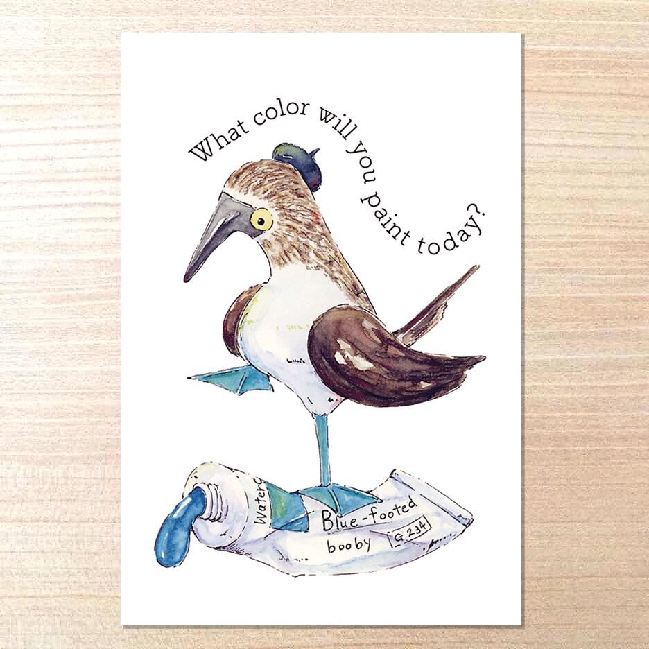 青色の絵の具を足で絞り出しているアオアシカツオドリのポストカードです。