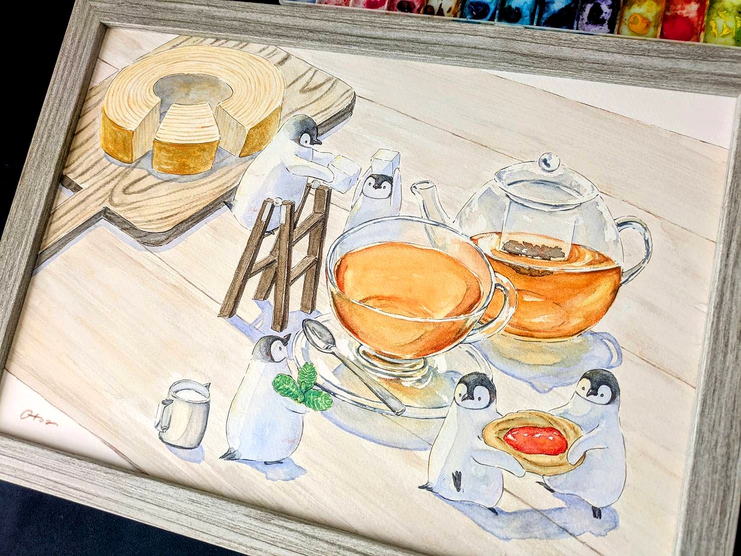ガラスの茶器の透明感とテーブルに落ちる光と影を、透明水彩で美しく表現しました。