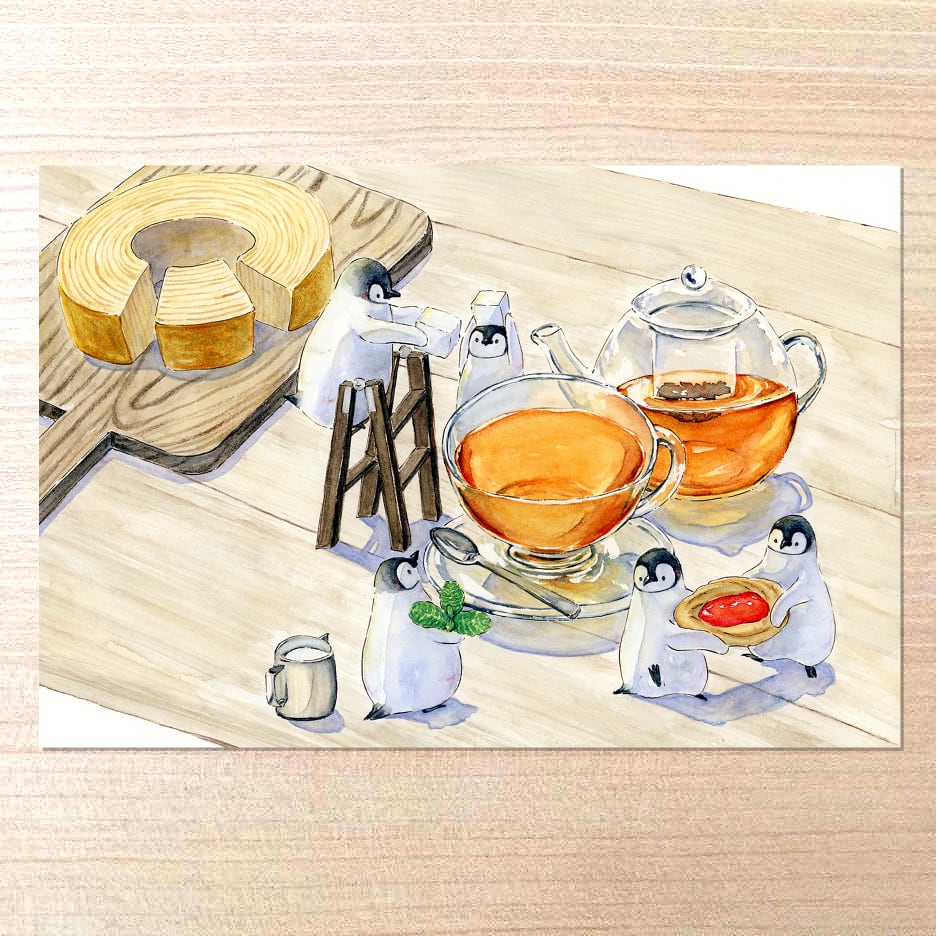 5羽のコウテイペンギンのひなが、お茶会の準備をしているポストカードです。