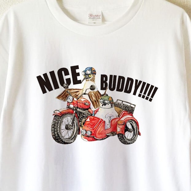 アオアシカツオドリとコウテイペンギンのひなが、サイドカーに乗っているユニークなデザインのTシャツです。