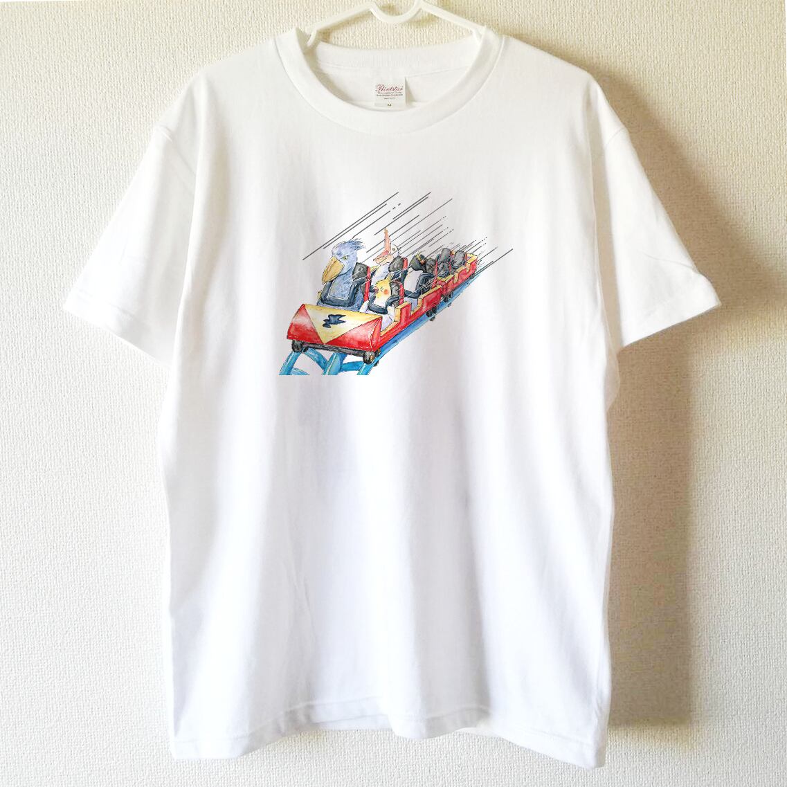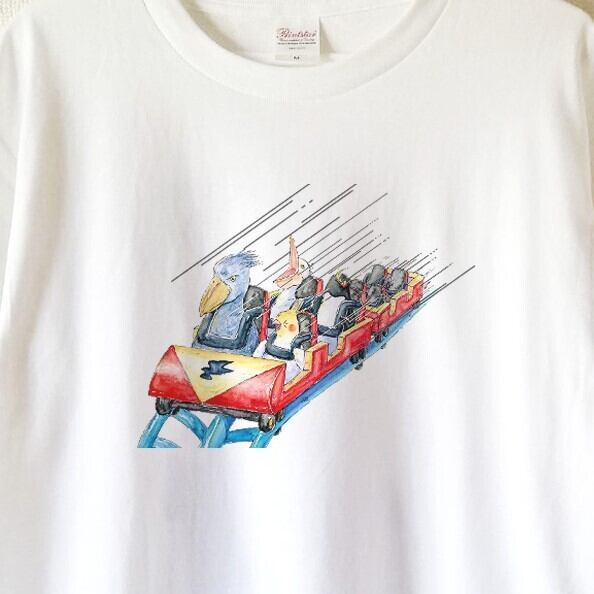 ハシビロコウが仲間の鳥たちとジェットコースターに乗っているTシャツです。