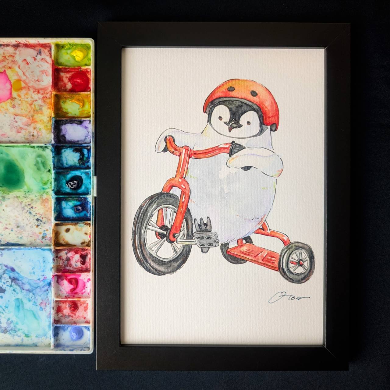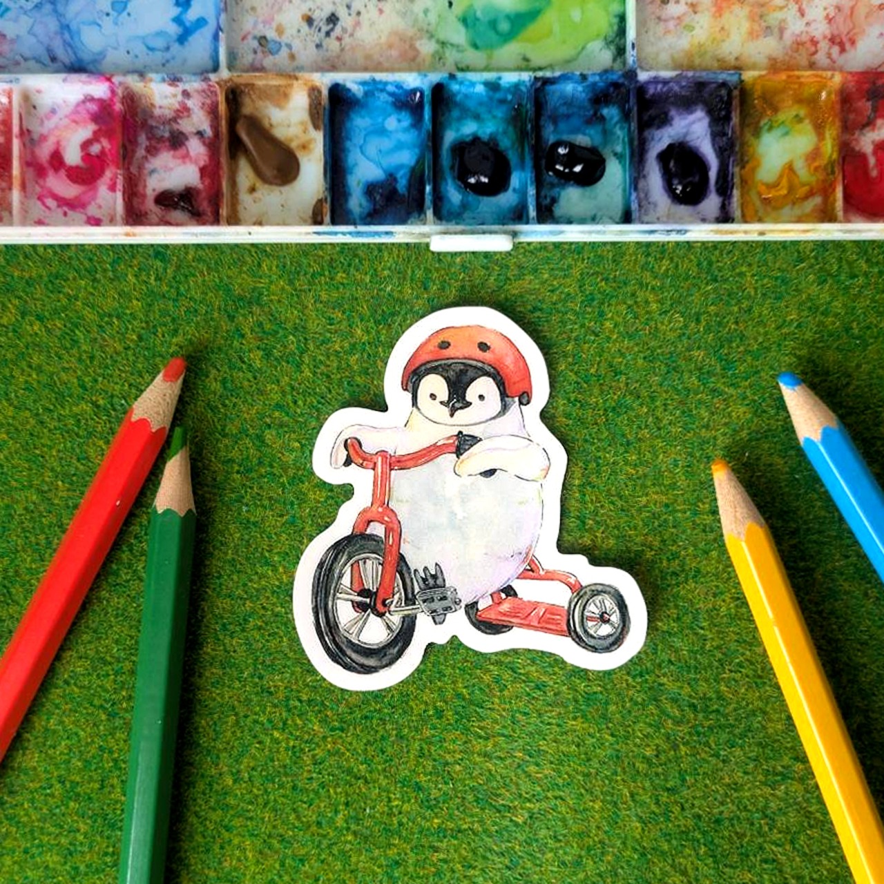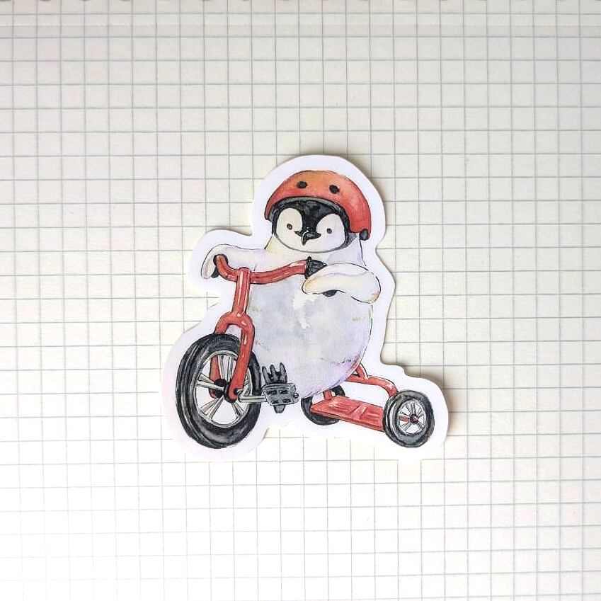 コウテイペンギンのひなが赤色の三輪車に乗っているステッカーです。