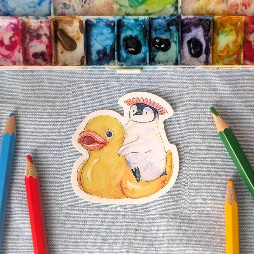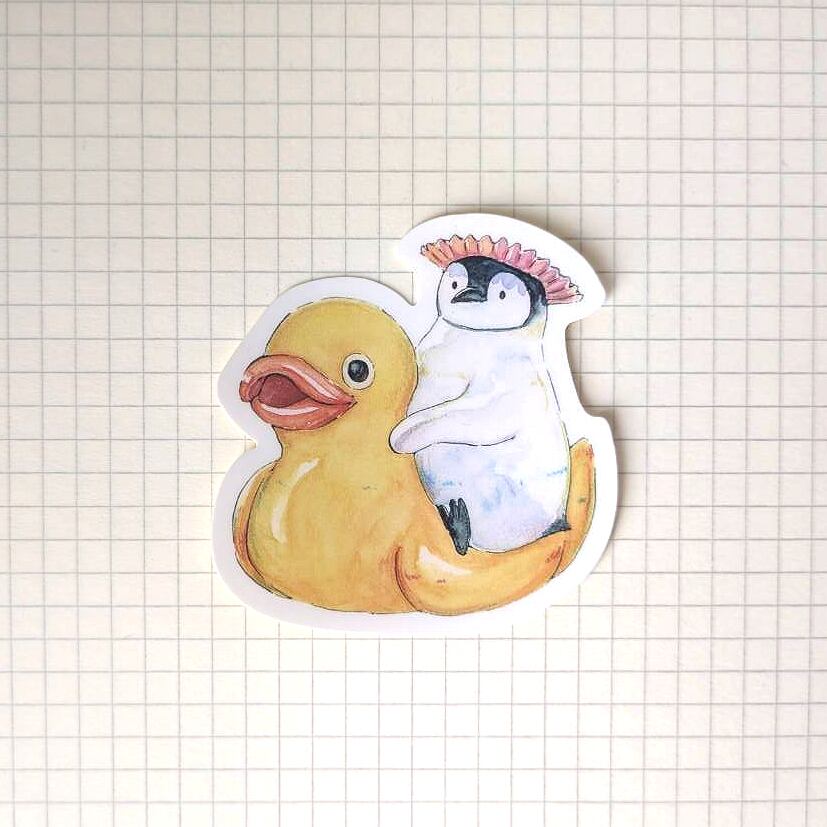コウテイペンギンのひながお風呂のアヒルに乗っているステッカーです。