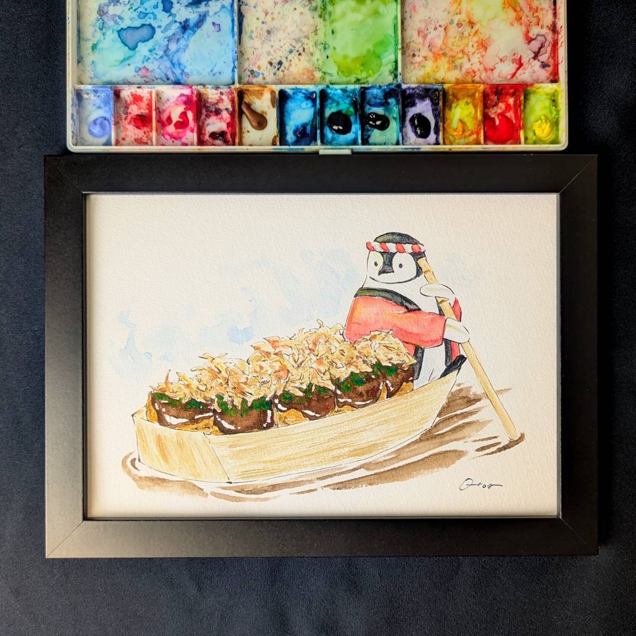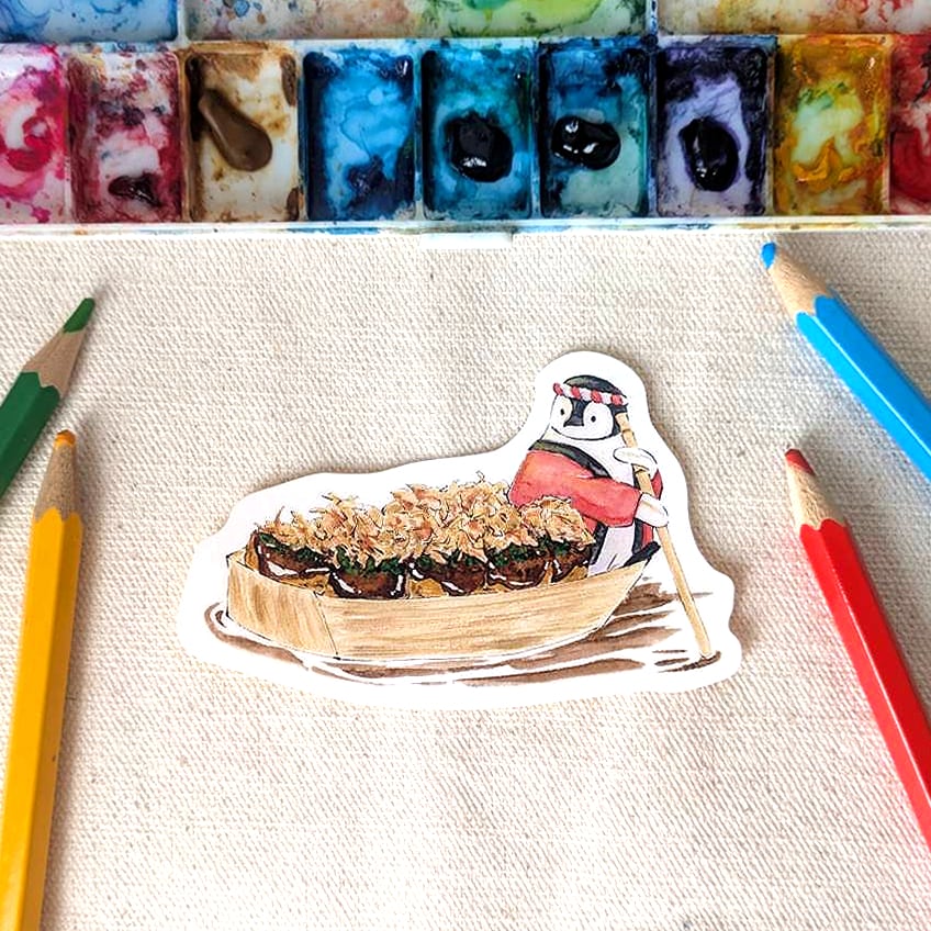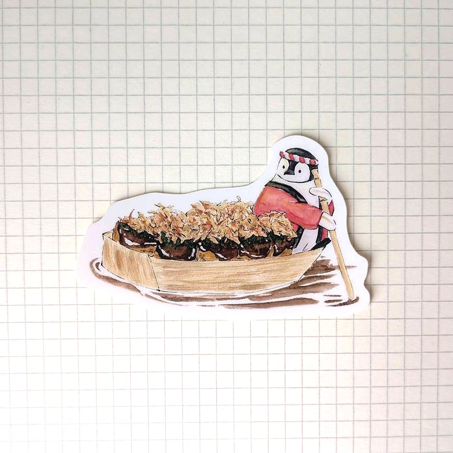 たこ焼きの舟とペンギンの船頭さんのステッカーです。
