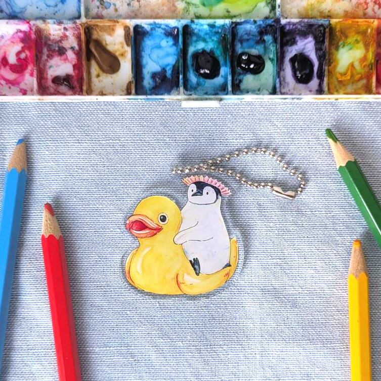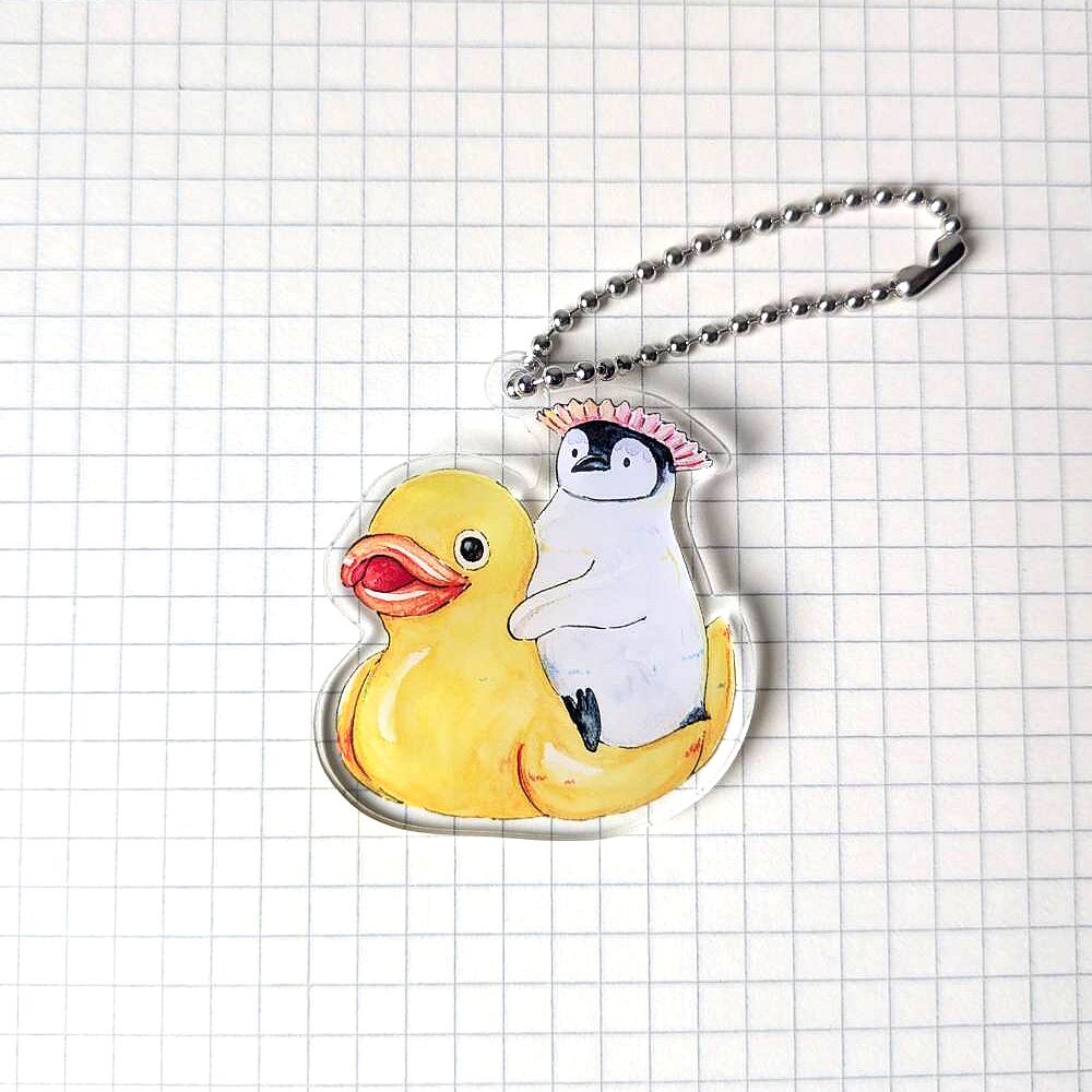 コウテイペンギンのひながお風呂のアヒルに乗っているアクリルキーホルダーです。
