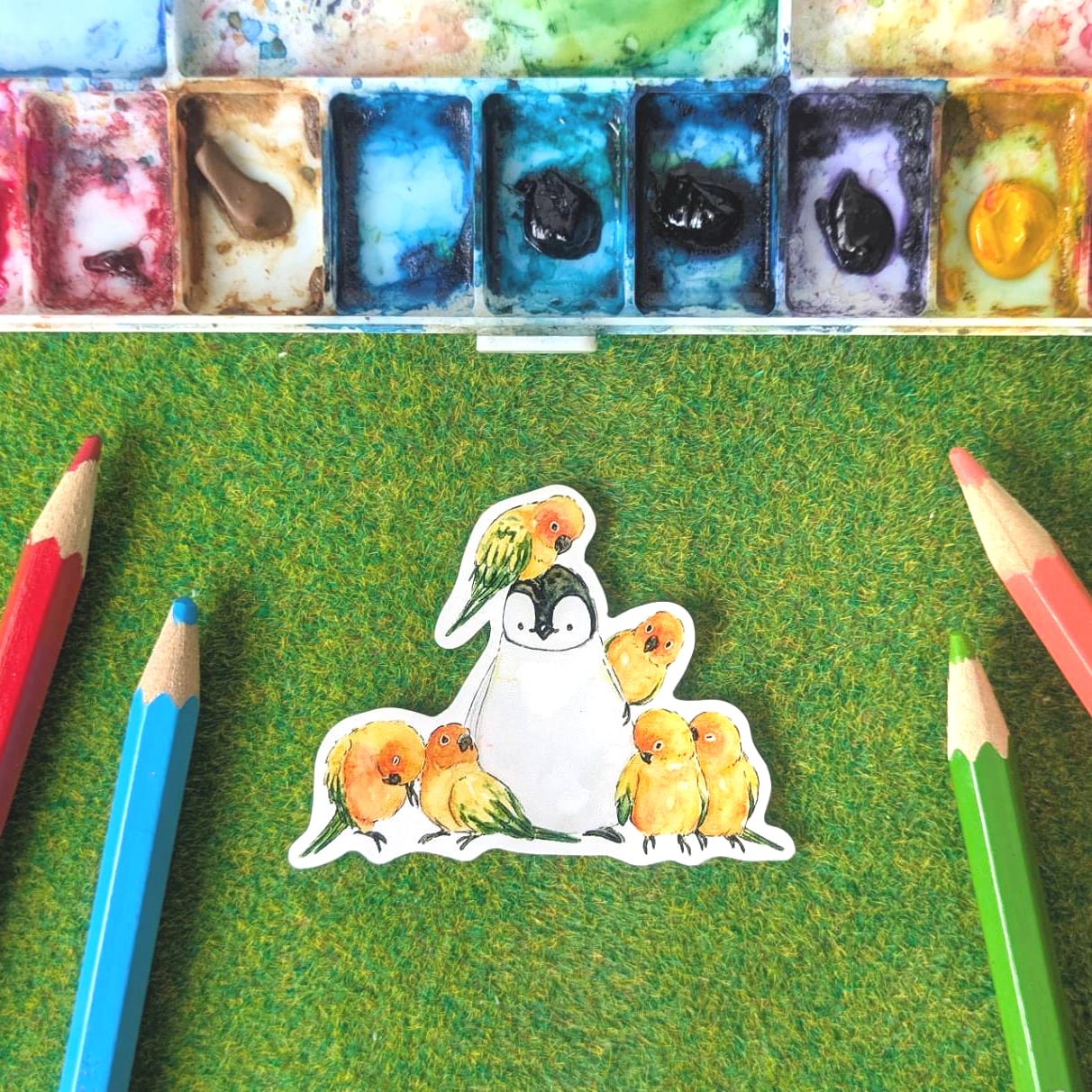 コガネメキシコインコとペンギンをモチーフにしたステッカーです。