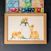 白黒動物のペンギンに色鮮やかインコたちが映えるユニークで可愛らしいデザインです。