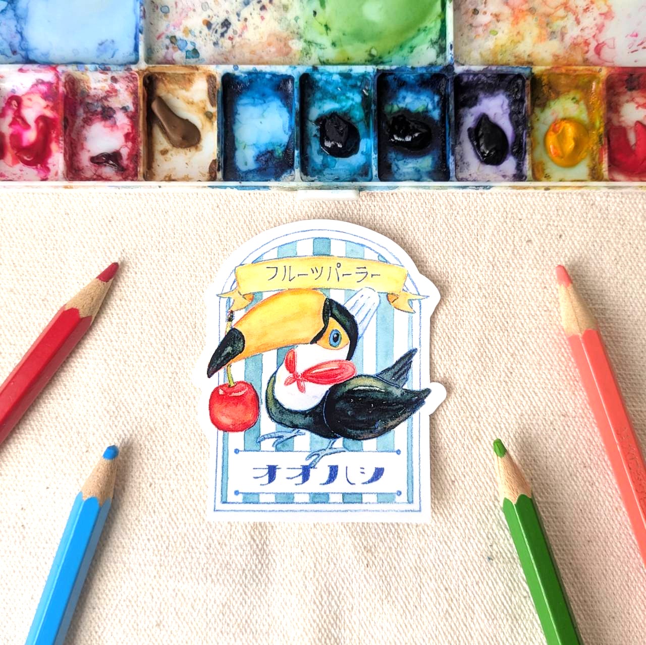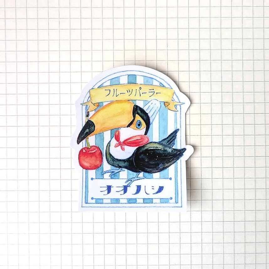 オニオオハシが営むフルーツパーラーのお店をイメージしたステッカーです。