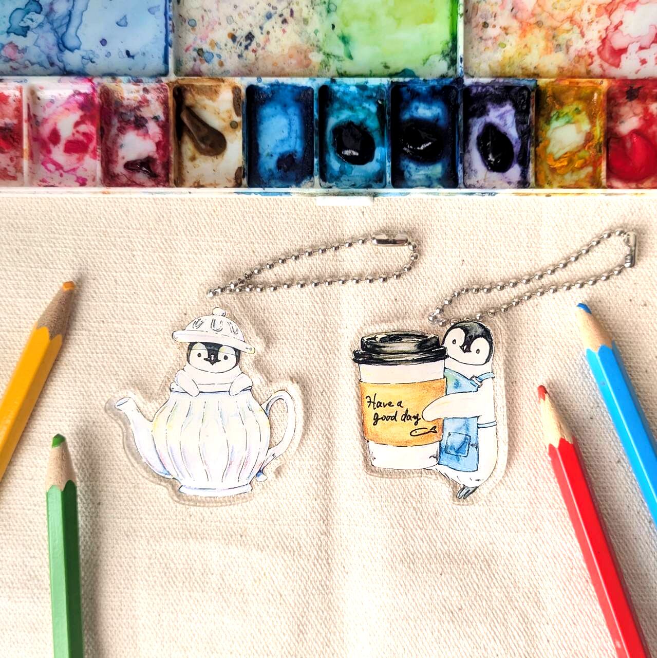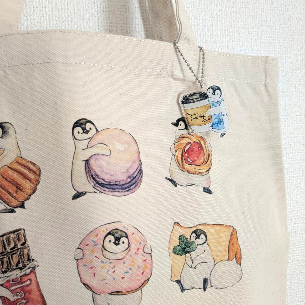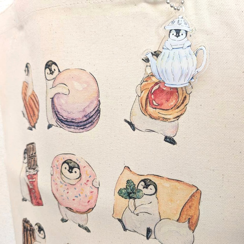 コウテイペンギンのひなとカフェドリンクをモチーフにしたアクリルキーホルダーです。