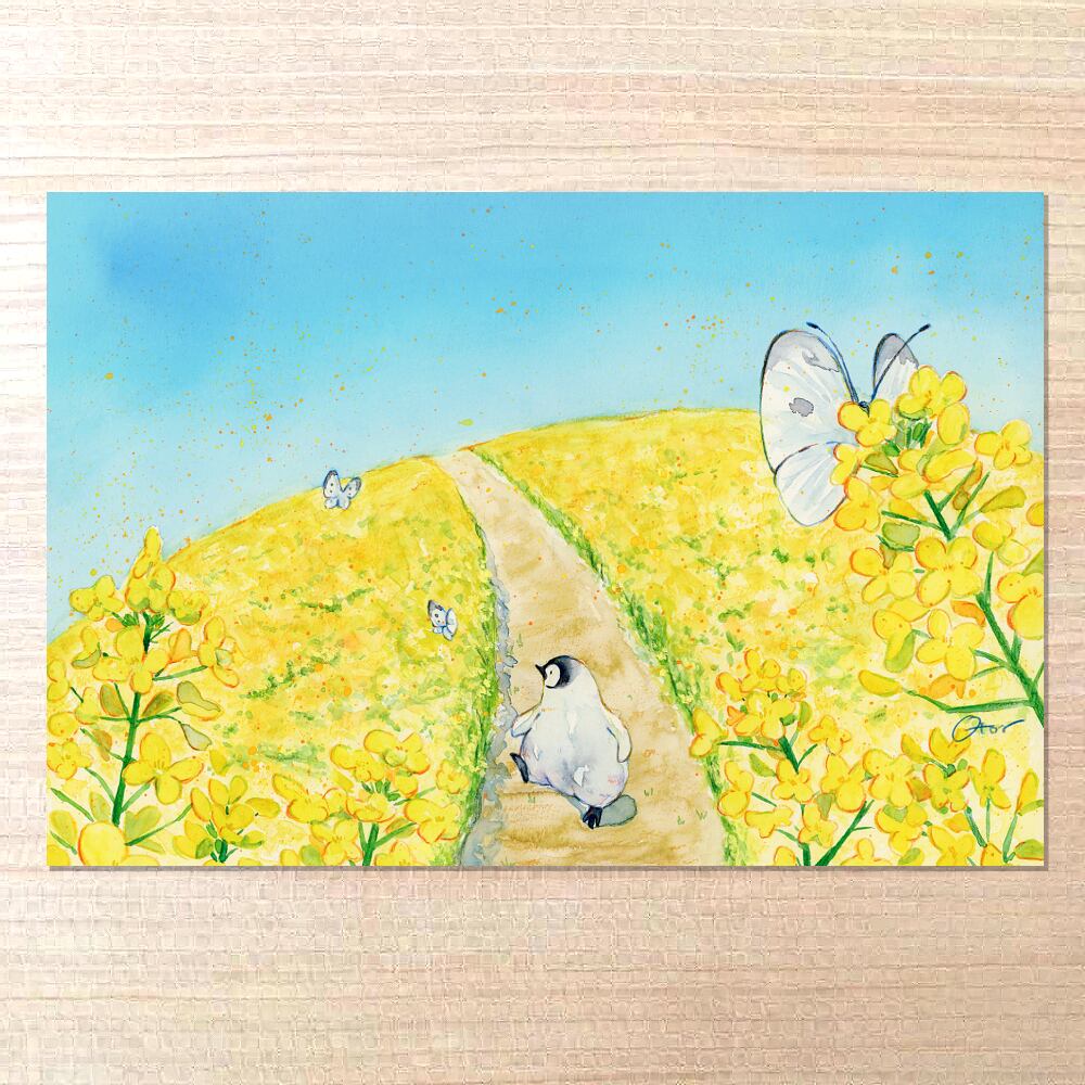 春の青空の下、コウテイペンギンのひなが菜の花畑の中をお散歩しているポストカードです。