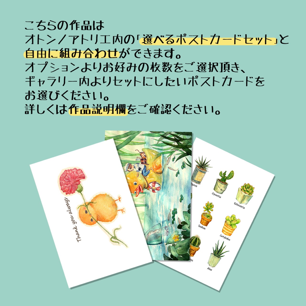 オトンノアトリエ内の「選べるポストカードセット」の作品の中から、お好みのデザインを自由に組み合わせることができます。