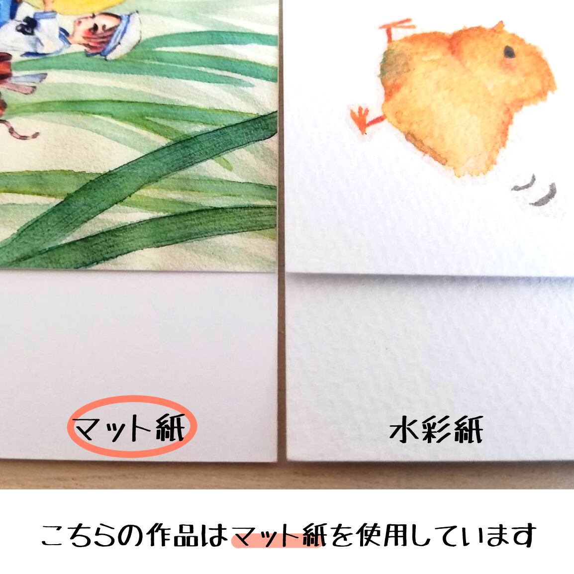 水彩絵の具や色鉛筆を使い、絵本風の優しいタッチで仕上げています。