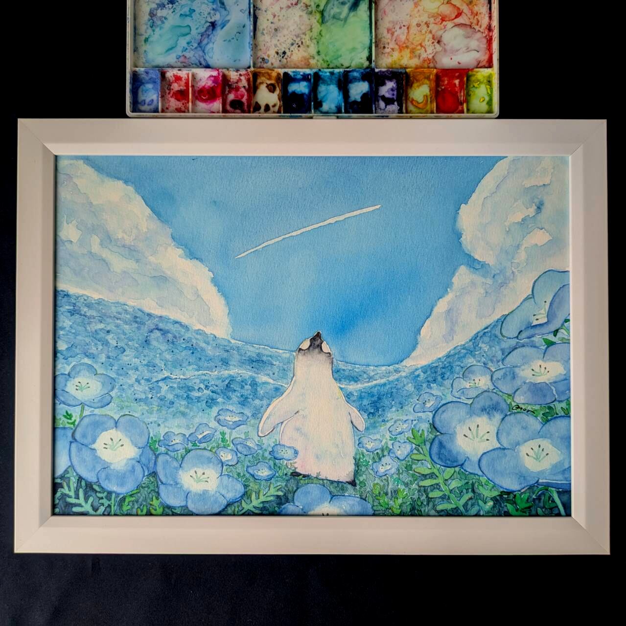タイトルの通りネモフィラ畑を大きな海に見立て、広がる空と飛行機雲を見上げるコウテイペンギンのひなを描きました。