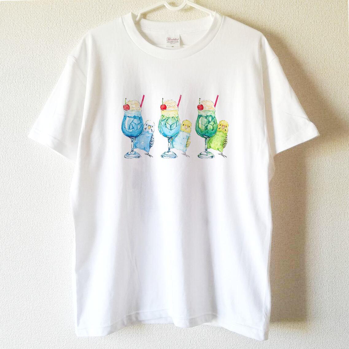 クリームソーダからひょっこり顔を出すセキセイインコたちが可愛いTシャツです。