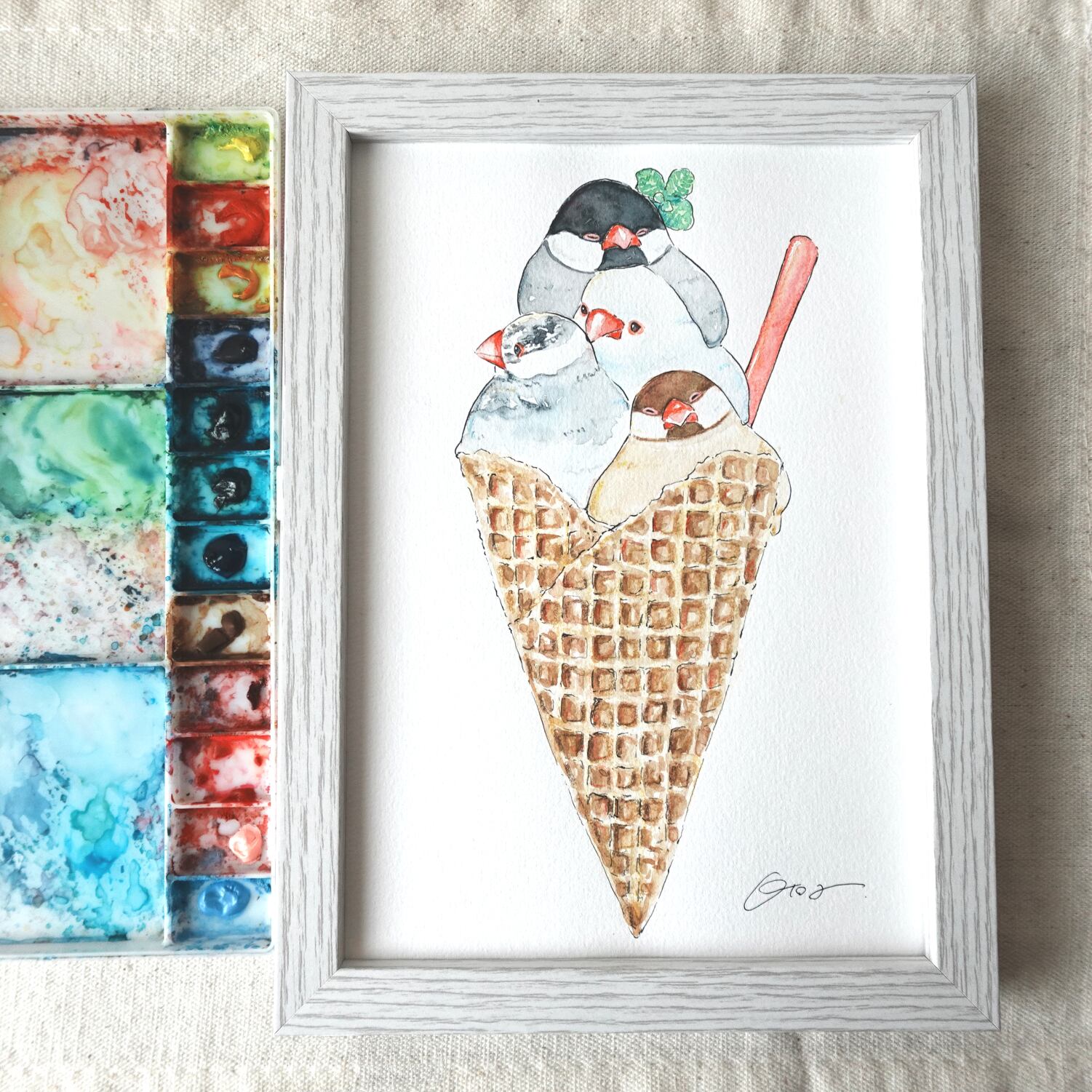 様々なカラーの文鳥を重ねてアイスクリーム風のデザインにしました。