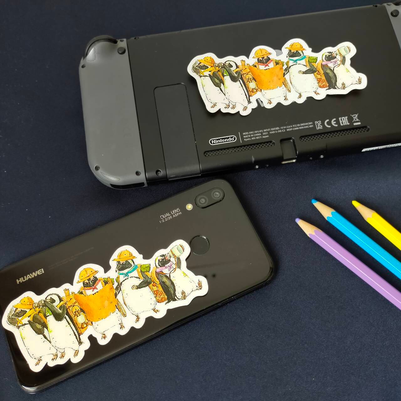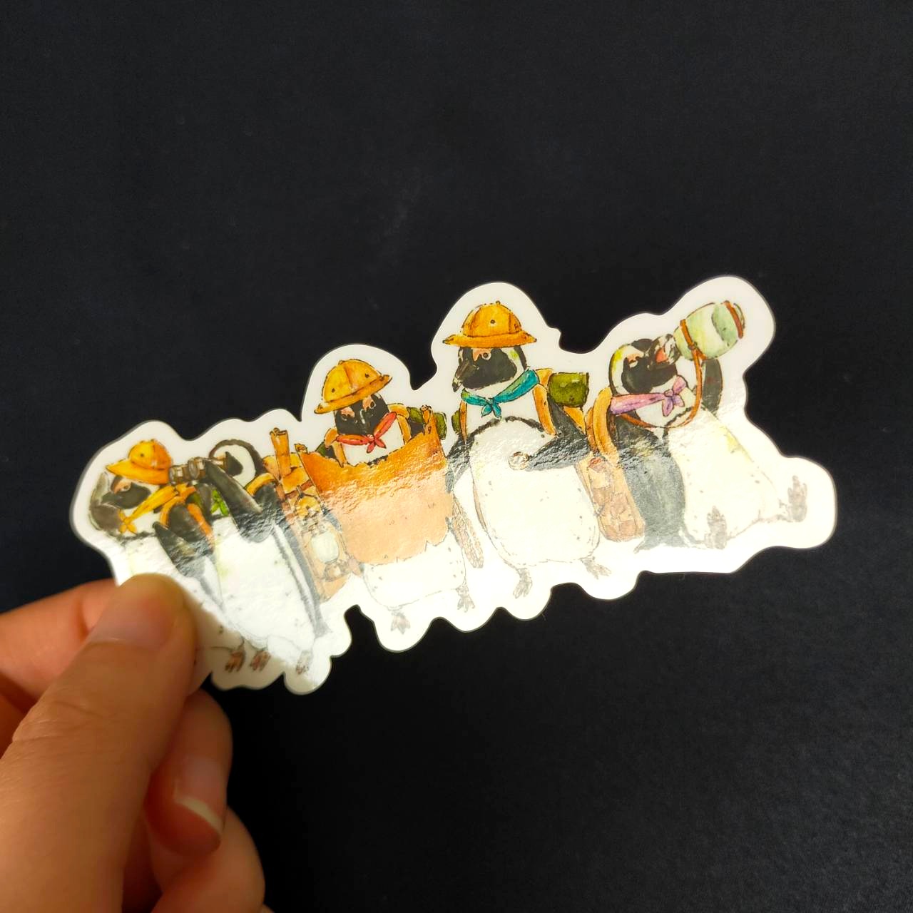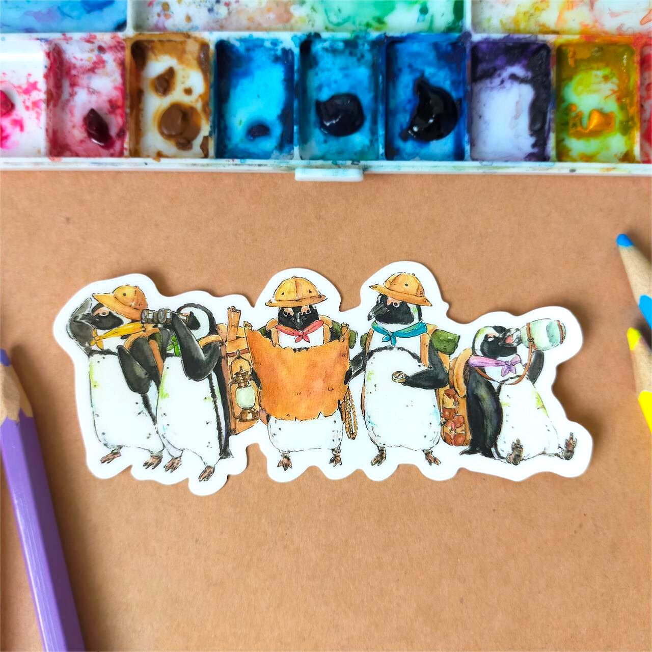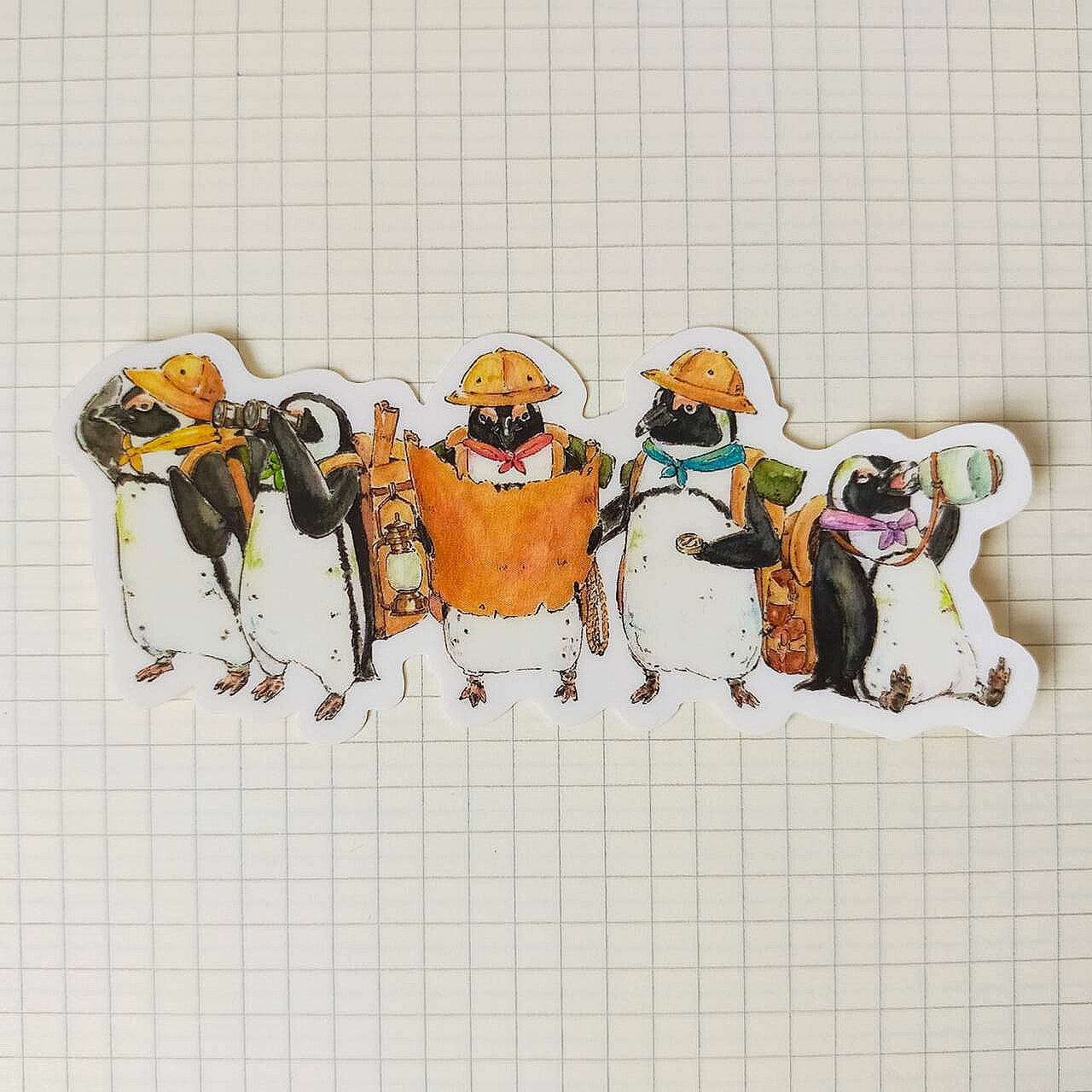 ケープペンギンたちが探検隊の格好で冒険しているステッカーを作りました。