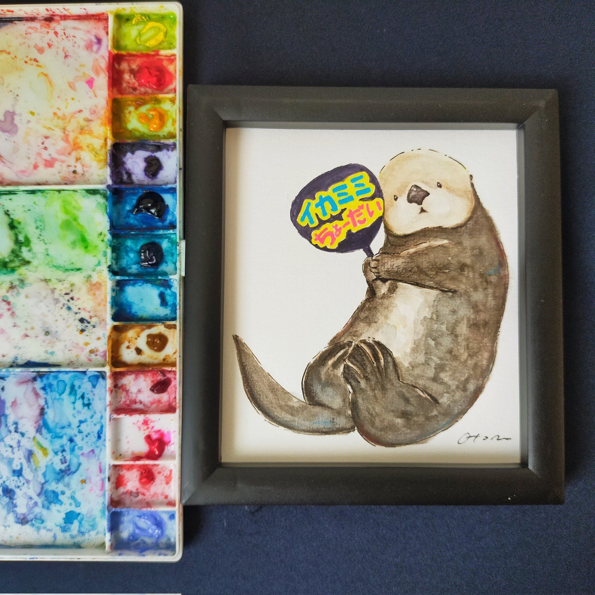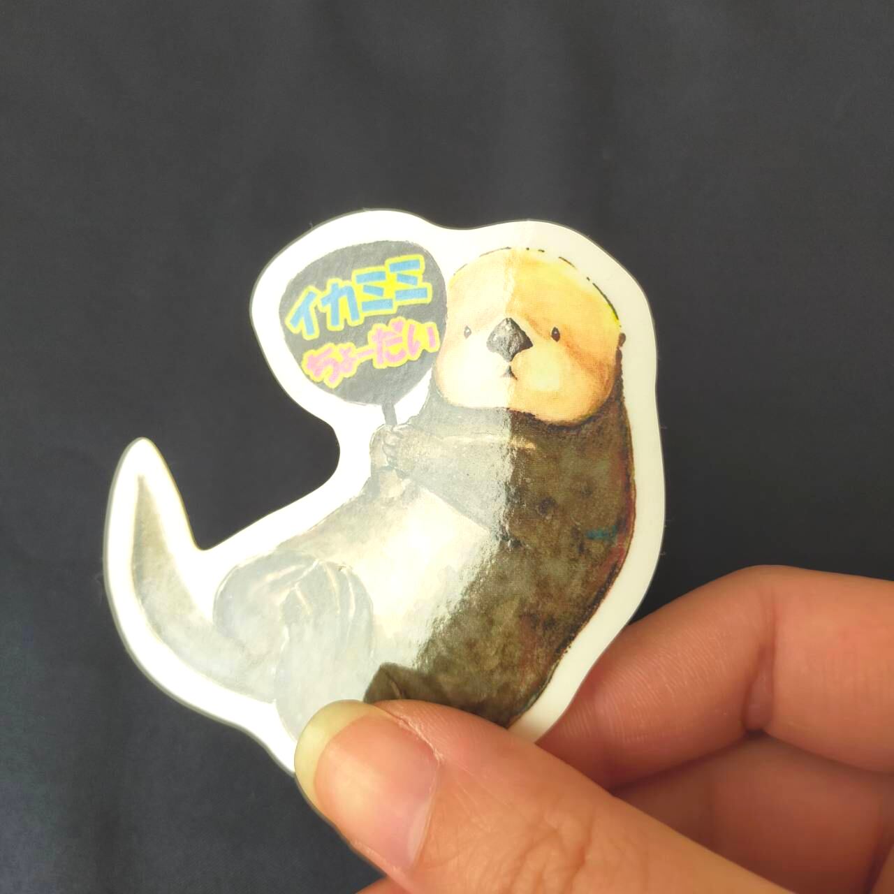 ラッコがファンサうちわを持って、推し(大好物)にアピールしているステッカーです。